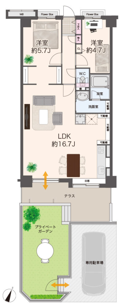 1階部分で、南向きで陽当り、風通し、良好な2LDK。
